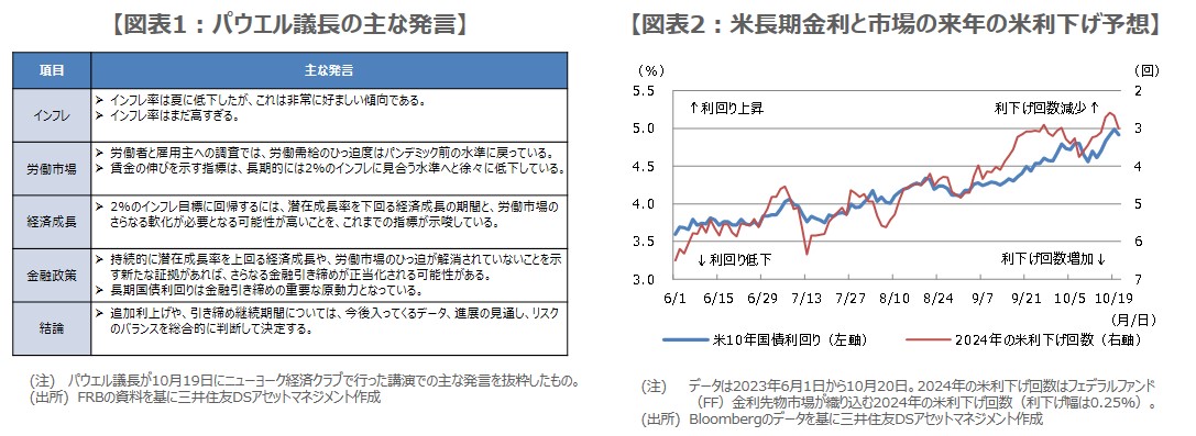 そして、パウエル議長の記者会見における発言については、10月19日にニューヨーク経済クラブで講演を行った際の発言と、おおむね同じ内容になると予想されます。19日の主な発言は図表1の通りで、インフレと労働需給ひっ迫の低下傾向を歓迎する一方、インフレ率はまだ高すぎる水準にあり、2%への回帰には労働市場のさらなる軟化が必要である可能性が高い点を指摘していました。