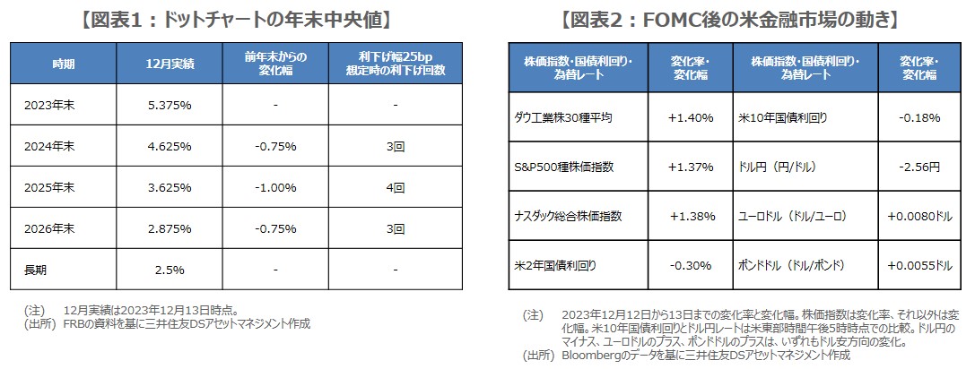 次に、FOMCメンバーが適切と考える「政策金利水準の分布図(ドットチャート)」について、前回9月時点では、2024年は25ベーシスポイント(bp、1bp=0.01%)の利下げ2回、2025年は5回、2026年は4回が適切との見方が示されましたが、今回は2024年が3回、2025年は4回、2026年は3回となりました(図表1)。注目されていた2024年の利下げ回数が2回から3回に増えたことで、市場は素直にハト派と受け止めたとみられます。