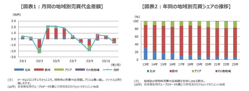 欧州からの日本株買いの動きは7月以降に一服し、8月、9月、12月は売り越しに転じましたが、2023年の1年間では約2.6兆円の買い越しとなりました。海外投資家全体での年間売買代金差額は約3.2兆円の買い越しでしたので、欧州の買い越しが大半を占めています。なお、北米は