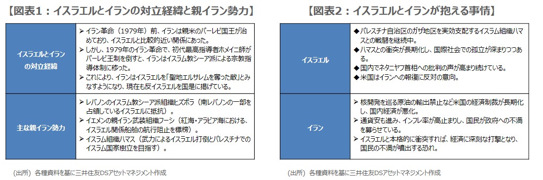 ただ、イスラエルとイラン、それぞれが抱える事情を踏まえると、イスラエルがイランに対し報復攻撃に踏み切る可能性は低いと思われます(図表2)。イスラエルは、パレスチナ自治区のガザ地区を実効支配するイスラム組織ハマスとの戦闘を続けており、イランと報復の応酬に発展すれば、大きな負担となります。また、イランは米国の経済制裁などで国内経済が悪化しており、イスラエルとの本格交戦は避けたい意向があると推測されます。