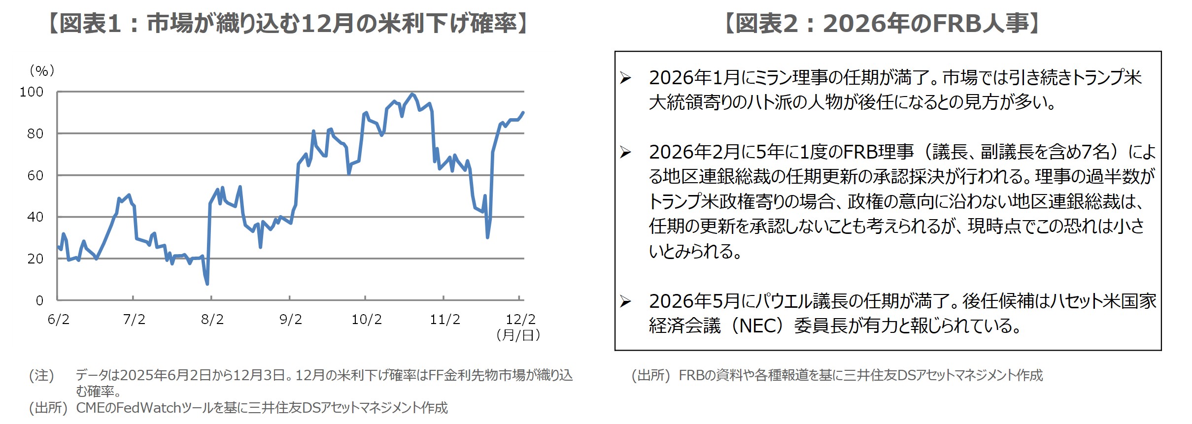 なお、2026年はトランプ米大統領寄りの人物がFRB議長や理事に就任するとの見方が多く(図表2)、市場では政策運営が過度にハト派に傾くのではないかとの懸念の声も聞かれます。弊社は2026年の米国経済について、比較的安定した景気と若干高めのインフレ率を見込んでおり、金融政策が経済・物価動向に沿って適切に決定されるのであれば、利下げは来年いっぱい見送られると予想しています。