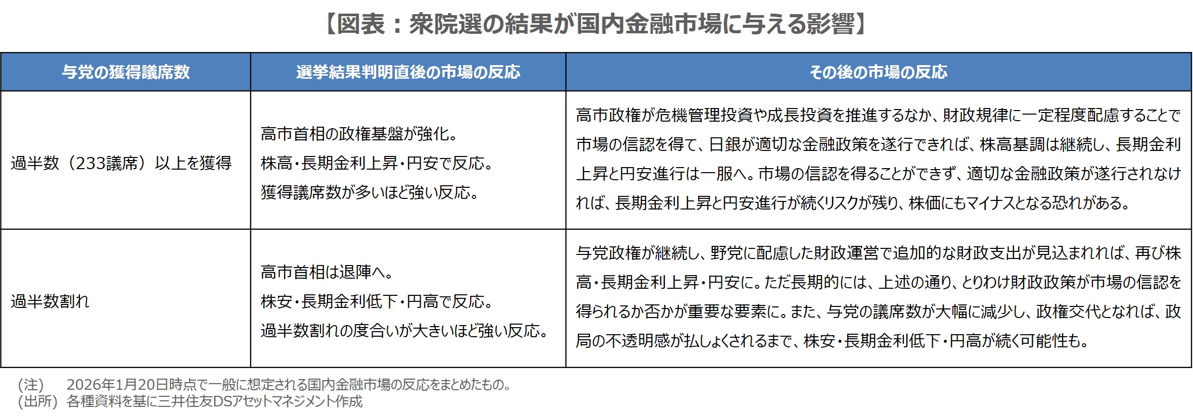 衆院選の結果が市場に与える影響については、財政政策が市場の信認を得られるか否かが重要