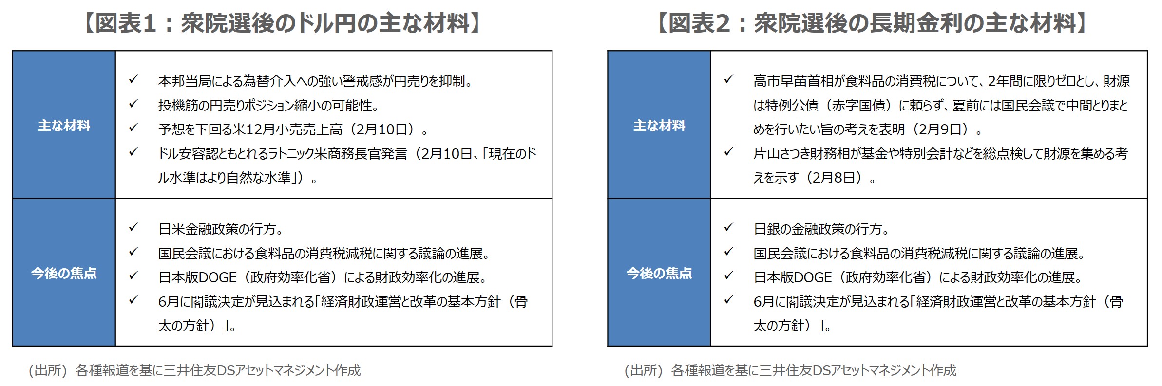 2月8日に投開票が行われた衆議院議員選挙について、市場では与党勝利なら株高と円安が進み、長期金利は上昇するとの見方が優勢でした。しかしながら実際は、日経平均株価が大幅高となった一方、ドル円はドル安・円高に振れ、長期金利も大きく上昇する展開には至りませんでした。以下、ドル円と長期金利が予想に反した動きとなった背景を探り、今後を展望します。
