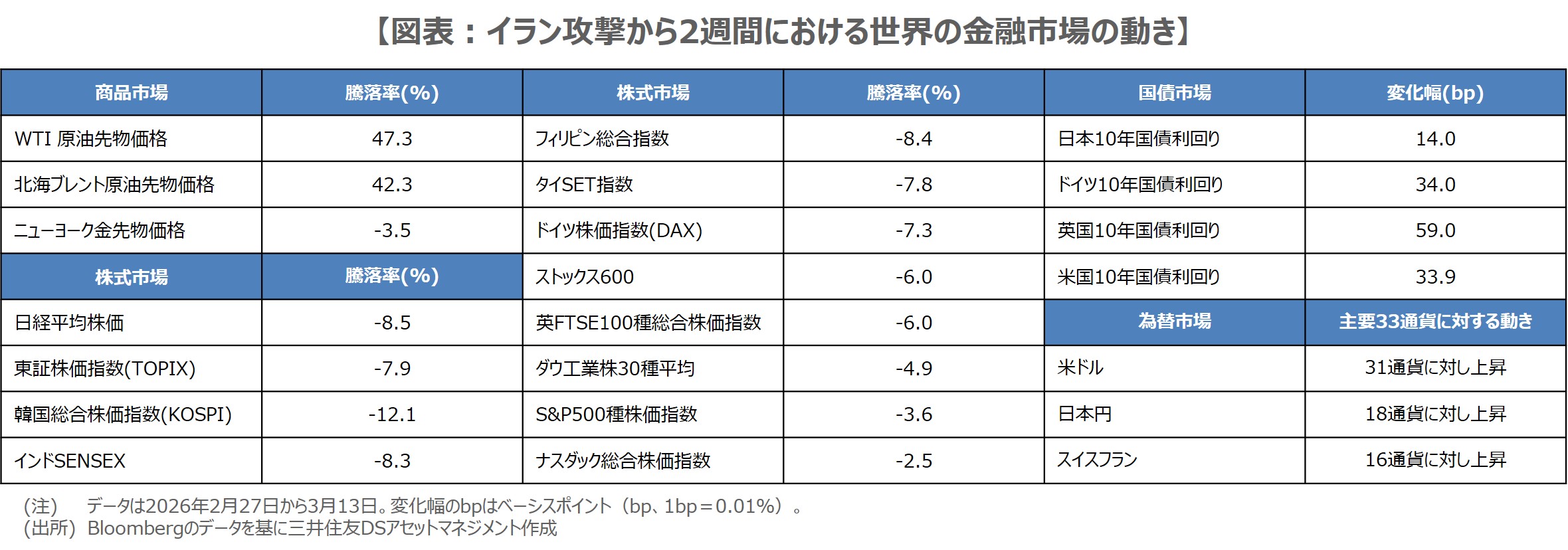 2月28日に米国とイスラエルがイランへの攻撃を開始してから3月14日で2週間が経過しました。空爆を受けるイランは徹底抗戦の構えを示し、イスラエルや湾岸諸国への攻撃を続けるなど、現時点で収束の気配はみられず、金融市場では紛争長期化への警戒が強まっています。そこで、今回のレポートでは、イラン攻撃から2週間で世界の金融市場はどう動いたか、検証していきます。