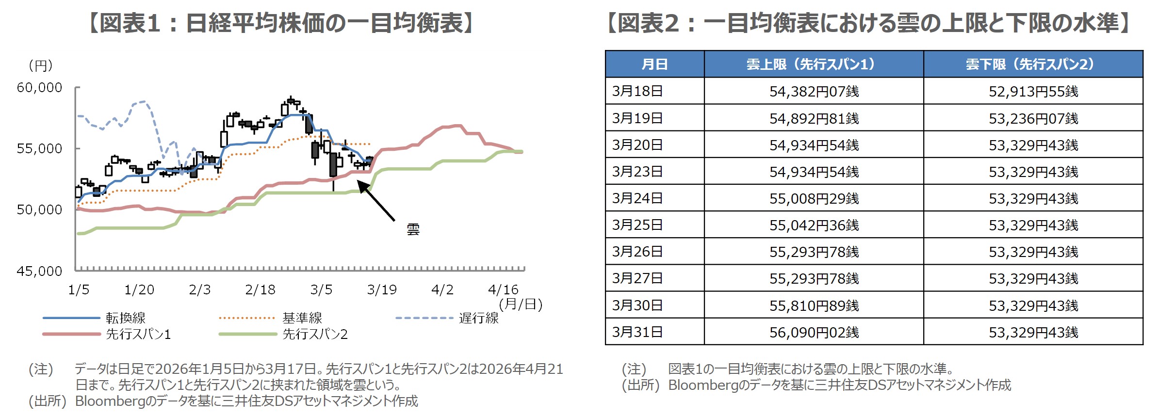 弊社は年末の日経平均は61,500円との見方を維持していますが、シナリオ2における日経平均は、しばらく不安定な動きが見込まれます。なお、3月10日付レポートで触れた日足の一目均衡表をみると、日経平均は雲にサポートされていることが分かります(図表1)。目先は、日経平均が雲の下限近辺の53,300円水準を大きく割り込むことなく、雲の上限近辺の54,900円水準をしっかり回復できるかが焦点になると思われます(図表2)。