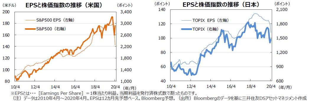 S&P500種指数の4月の1株当たり予想利益(EPS)は前年同月比▲18.0%(前月同▲7.7%)の142.35と大きく悪化しました。一方、東証株価指数(TOPIX)の予想EPSは107.69で、伸び率は同▲17.1%となりました(いずれもBloomberg予想)。米国株式市場は、月初は新型コロナ懸念から大幅下落となりましたが、新規感染者がピークアウトするとの見方が出たこと、FRBが間接融資や低格付け社債の買い入れなど企業金融を支えるために資金供給を大幅に拡大したことなどから安心感が広がりました。S&P500種指数が前月比+12.7%、NYダウが同+11.1%、ナスダック総合指数が同+15.4%と、主要指標は軒並み底打ちし、上昇に転じました。一方、日本株式市場も、欧米での新規感染者数の減少や米の治療薬への期待などから底打ちしましたが、緊急事態宣言から国内景気の回復が遅れるとの懸念が重石となりました。TOPIXが前月比+4.3%、日経平均株価が同+6.7%でした。
