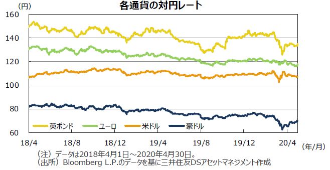 | 為替 | 米ドル、ユーロは各国の金融緩和を背景に対円で下落しました。豪ドルはこれまでの下落の反動や感染拡大の落ち着きなどから上昇しました。 |