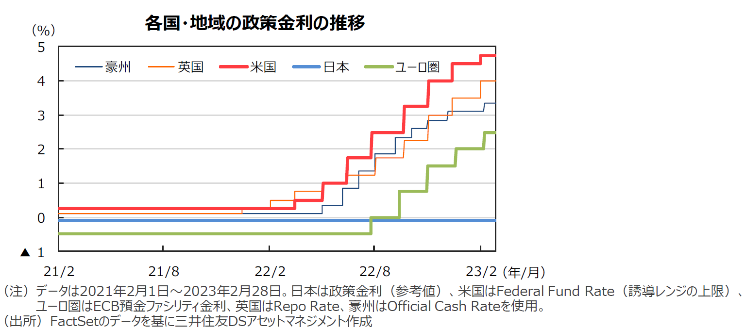 FRBは、2月の米連邦公開市場委員会(FOMC)でフェデラルファンド(FF)金利の誘導目標を4.25~4.50%から4.50~4.75%へ引き上げました。利上げ幅を前回の0.50%から0.25%に縮小し、通常モードに戻しました。ECBは2月の理事会で、預金ファシリティ金利などの0.50%引き上げを決めました。声明文で次回3月も0.5%の利上げを実施することを示唆しました。日銀は1月の金融政策決定会合で、大規模な金融緩和策の維持を決めました。「経済・物価情勢の展望(展望リポート)」では、物価上昇率見通しを22年度は3.0%、24年度は1.8%と前回から引き上げた一方、23年度は1.6%に据え置きました。政府は2月、次期日銀総裁に経済学者の植田和男氏を起用する人事案を国会に提示しました。