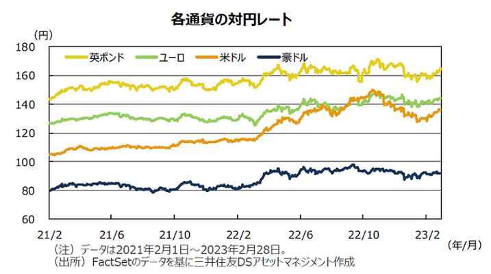 円相場は対米ドルで大幅に下落しました。堅調な米雇用統計をはじめ市場予想を上回る米経済指標の発表が相次ぎ、米長期金利が大きく上昇したことから、日米金利差の拡大を意識した円売りが加速しました。植田次期日銀総裁候補が大規模な金融緩和策を続ける考えを示したことも円の弱材料となりました。先月末130円近辺だった円の対米ドルレートは、月末136円台で終了しました。欧州の長期金利も大きく上昇したため、円は対ユーロレートでも下落し、1ユーロ=144円台で終了しました。一方、円の対豪ドルレートは1豪ドル=91円台で概ね横ばいでした。失業率の悪化などから豪ドルが対米ドルで下落したことが背景です。