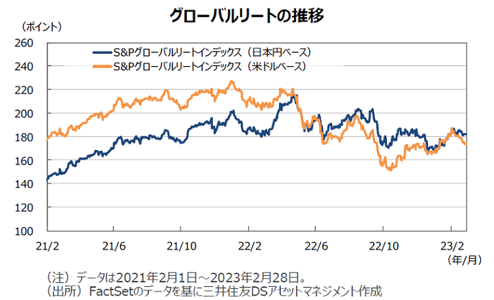 グローバルリート市場(米ドルベース)は下落しました。米国のリート市場は、堅調な米経済指標の発表が相次ぎ、FRBの利上げ停止が遠のいたとの観測から米長期金利が大きく上昇したことを嫌気して下落しました。一方、株価の上昇を好感して欧州のリート市場は上昇しました。日本のリート市場は、植田次期日銀総裁候補が金融緩和政策を継続する考えを示したことを受けて反発しました。S&Pグローバルリート指数(米ドルベース)のリターンは前月末比▲4.6%となりました。一方、為替効果はプラスに寄与し、円ベースのリターンは同▲0.1%となりました。