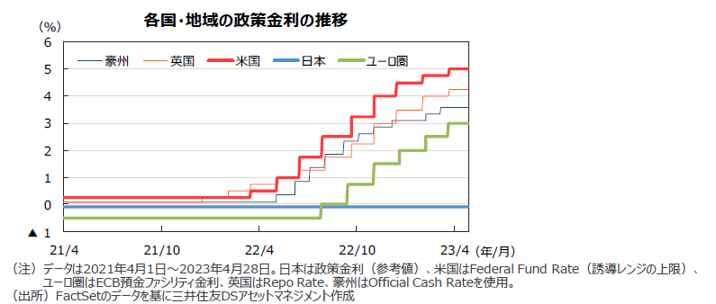 FRBは、3月の米連邦公開市場委員会(FOMC)でフェデラルファンド(FF)金利の誘導目標を4.50~4.75%から4.75~5.00%へ引き上げました。米銀の相次ぐ破綻を受けて金融不安が高まりましたが、インフレの抑制を優先し、0.25%の利上げを実施しました。ECBは3月の理事会で、3会合連続となる0.50%の大幅利上げを決めました。保有資産の圧縮については、6月にかけて月150億ユーロ規模で削減する方針です。日銀は、植田和男新総裁の初めての定例会合となる4月の金融政策決定会合で、大規模な金融緩和策の維持を決めました。注目されていた長短金利操作(イールドカーブ・コントロール)の修正は見送りました。