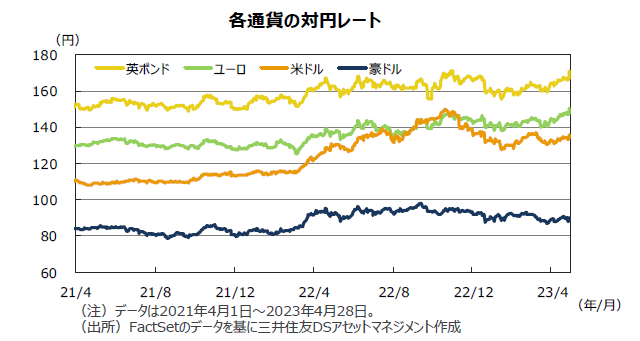4月の円相場は主要通貨に対し下落しました。円は米ドルに対し、米長期金利の低下に伴い、月初に1ドル=131円台まで上昇しました。しかし、その後米長期金利が反発したことや、植田日銀新総裁が就任後初の記者会見で、現行の緩和策を当面維持する方針を示したことから、円はじりじりと下落しました。月末には日銀が大規模緩和策を維持したことを受けて、日米の金融政策の方向性の違いが意識され、136円台に下落しました。円の対ユーロレートは大きく下落しました。ECB高官から金融引き締めに積極的なタカ派発言が相次ぎ、日欧の金融政策の方向性の違いから円売り・ユーロ買いが膨らみ、約14年半ぶりに1ユーロ=150円を付けて終了しました。また、円は、利上げ観測が後退した豪ドルに対しても小幅に下落しました。