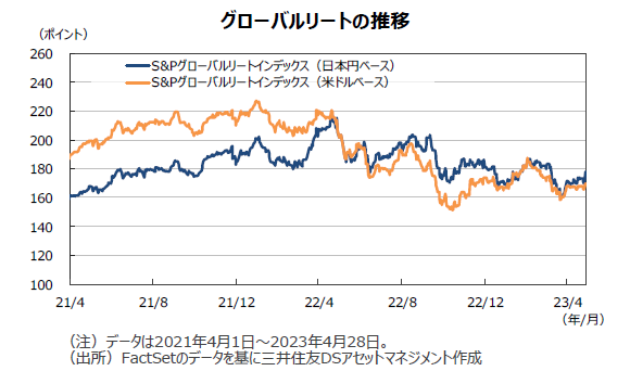 グローバルリート市場(米ドルベース)は、欧米の株式市場が上昇するなか、小幅に反発しました。米国リート市場は、金融不安による信用収縮が商業用不動産に与える影響が引き続き懸念されたものの、FRBの利上げ停止観測の高まりで米長期金利が低下したことや株式市場が上昇したことが支えとなり、小幅に上昇しました。欧州、日本、アジアのリート市場も堅調な株式市場に支えられ、上昇しました。S&Pグローバルリート指数(米ドルベース)のリターンは前月末比+1.3%となりました。また、為替効果がプラスに寄与し、円ベースのリターンは同