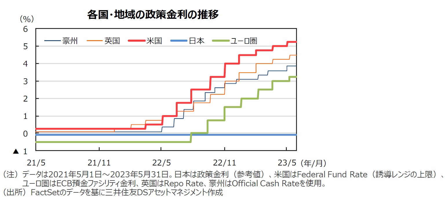 FRBは、5月の米連邦公開市場委員会(FOMC)でフェデラルファンド(FF)金利の誘導目標を4.75~5.00%から5.00~5.25%へ引き上げました。声明文では、金融不安がくすぶっていることを踏まえて、利上げ打ち止めの可能性を示唆しました。ECBは5月の理事会で0.25%の利上げを決め、前回までの3会合連続の0.50%から利上げ幅を縮めました。保有資産の圧縮については、7月には再投資を終える予定です。日銀は、植田和男新総裁の初めての定例会合となる4月の金融政策決定会合で、大規模な金融緩和策の維持を決めました。注目されていた長短金利操作(イールドカーブ・コントロール)の修正は見送りました。