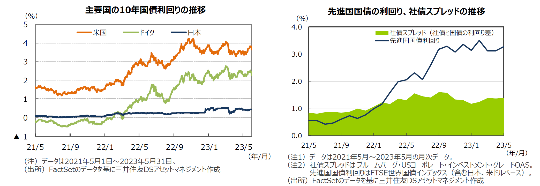 米国債券市場は月後半に軟調な展開となり、10年国債利回り(長期金利)が上昇しました。4月の雇用統計が雇用の底堅さを示し、米景気悪化への過度な懸念が和らいだことや、FRB高官から利上げ停止に慎重な発言が相次ぎ、FRBによる利上げが続くとの観測が高まったことに加えて、米政府の債務上限問題も嫌気されて、米長期金利は上昇しました。一方、ドイツの長期金利は、ECBによる利上げ継続が見込まれるものの、景気減速見通しからやや低下しました。日本の長期金利は、日銀による政策修正観測が後退したことから小動きとなり、ほぼ横ばいでした。また、投資適格社債については、国債と社債の利回り格差が小幅に拡大しました。