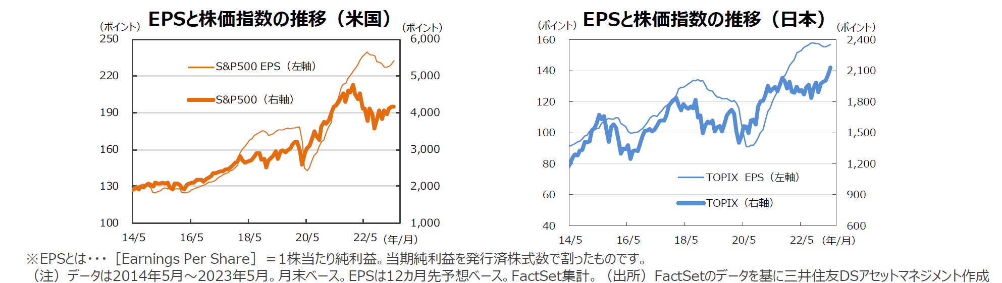 S&P500種指数の5月の予想1株当たり利益(EPS)は232.6で、前年同月比▲2.5%でした。前月比は+1.1%と4カ月連続のプラスとなりました。一方、TOPIXの予想EPSは156.8、前年同月比は+2.4%でした。前月比は+0.5%と2カ月連続のプラスでした。