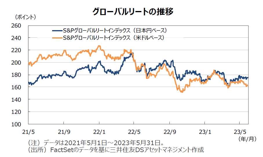 グローバルリート市場(米ドルベース)は、FRBの金融引き締め長期化観測が強まり、米長期金利が上昇したことを嫌気して、下落しました。米国リート市場は、FRBによる利上げが続くとの見方が強まったことや、金融不安による信用収縮が商業用不動産に与える影響が懸念されたため、軟調な展開となりました。欧州やアジアのリート市場も米国市場の下落を受けて軟調に推移しました。日本リート市場はほぼ横ばいでした。S&Pグローバルリート指数(米ドルベース)のリターンは前月末比▲3.9%となりました。また、為替効果がプラスに寄与し、円ベースのリターンは同▲1.4%となりました。