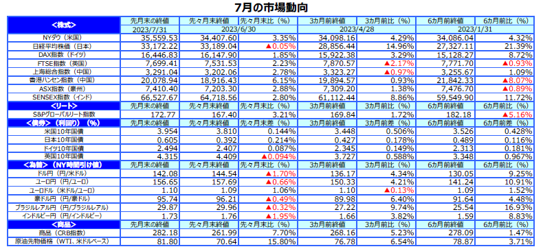 7月の主要国の株式市場は、米国景気のソフトランディング(軟着陸)期待が高まり、投資家のリスク選好姿勢が強まったことから、概ね上昇しました。米国株式市場は、米国景気が堅調な雇用を背景に底堅く推移するなか、インフレの鈍化傾向が見られたことを好感して、NYダウが13営業日連騰するなど、堅調な展開となりました。欧州の株式市場は、欧州中央銀行(ECB)が利上げを長期間継続するとの見方が後退したことなどから、上昇しました。日本の株式市場は、月初に33年ぶりの高値を付けた後、ETFの分配金に伴う売りによる需給悪化などから下落したものの、月末にかけて値を戻し、ほぼ横ばいでした。中国株式市場は、中国政府の景気刺激策への期待などから、上海総合指数、香港ハンセン指数ともに上昇しました。 |