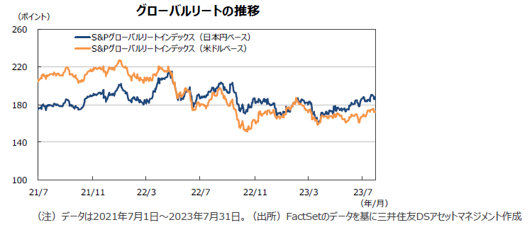 グローバルリート市場(米ドルベース)は、米国のソフトランディング期待が高まり、投資家のリスク選好姿勢が強まったことから、上昇しました。米国リート市場は、米国景気が底堅く推移していることから長期金利が上昇したものの、インフレが鈍化傾向を示したことからソフトランディングの期待が高まり、株式市場が堅調に推移したことを好感して、上昇しました。欧州やアジアのリート市場も株式市場の上昇を好感して、反発しました。日本リート市場も、日銀によるYCC修正で長期金利が上昇したものの、上昇しました。S&Pグローバルリート指数(米ドルベース)のリターンは前月末比+3.2%となりました。また、為替効果がマイナスに寄与し、円ベースのリターンは同+1.5%となりました。