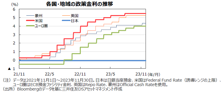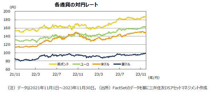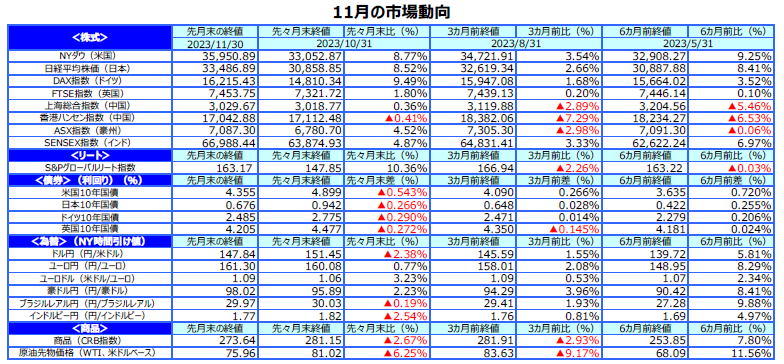 11月の主要国の株式市場は、世界的に長期金利が大きく低下したことを受けて、投資家のリスク選好姿勢が強まったことから、中国を除き上昇しました。米国株式市場は、米連邦準備制度理事会(FRB)による利上げ局面が終了したとの見方が強まり、米長期金利が大幅に低下したことを好感して、大きく上昇しました。欧州の株式市場も、長期金利が低下するなか、米国株の上昇を受け、堅調な展開となりました。日本の株式市場も、日本企業の決算が好調なことや、米長期金利の急低下に伴いハイテク株などに買い戻しが入ったことから、大幅な上昇となりました。一方、中国株式市場は、景気対策期待が下支えとなったものの、中国不動産市場の低迷による景気減速懸念などから上値が重く、上海総合指数、香港ハンセン指数ともにほぼ横ばいでした。 |