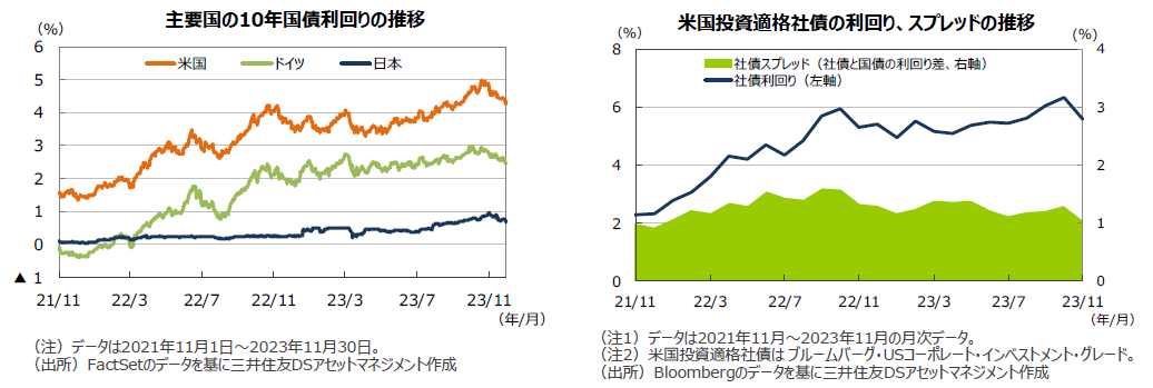 ●米国の10年国債利回り(長期金利)は、FRBが月初のFOMCで2会合連続の政策金利据え置きを決めたことを受けて、利上げ局面が終了したとの観測が強まったことから、大きく低下しました。その後もインフレ鈍化を示す経済指標が続いたため、月末にかけて一段と低下しました。