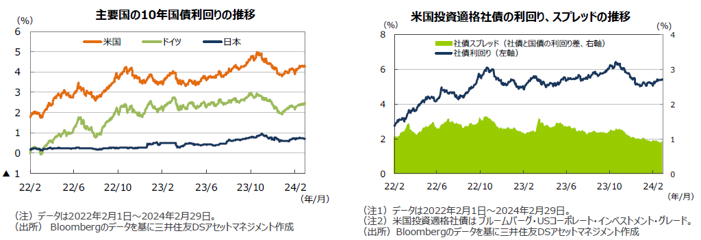 米国の10年国債利回り(長期金利)は、米経済指標が市場の予想以上の強さを示したことや、FRBが早期利下げに慎重であるとの見方が広がったことから上昇しました。ドイツの長期金利は、欧州中央銀行(ECB)の早期利下げ観測が後退したことや、米長期金利が上昇したことを受けて上昇しました。一方、日本の長期金利は、実質GDPが2四半期連続のマイナス成長となり、日銀による早期の金融緩和修正観測が後退したことなどから低下しました。 |