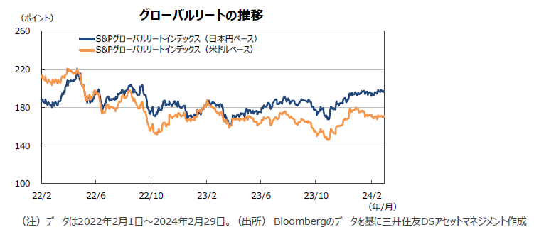 ●グローバルリート市場(米ドルベース)は、米欧の中央銀行による早期の利下げ観測が後退し、長期金利が上昇したものの、横ばいで終了しました。S&Pグローバルリート指数のリターンは前月末比+0.1%でした。また、円ベースのリターンは、為替効果がプラスに寄与し、同+2.5%となりました。