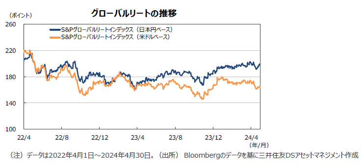 ●グローバルリート市場(米ドルベース)は、各国の長期金利が上昇したことを受けて、大きく下落しました。S&Pグローバルリート指数のリターンは前月末比▲6.4%でした。また、円ベースのリターンは、為替効果がプラスに寄与し、同▲2.7%となりました。