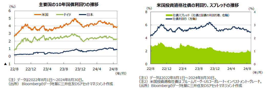 米国の10年国債利回り(長期金利)は、FRBが9月に利下げを開始するとの見方が改めて強まったことから節目の4%を下回り、一時3.8%を割り込む局面を経て、3.9%に低下しました。ドイツの長期金利は、欧州中央銀行(ECB)のラガルド総裁が追加利下げについて慎重な姿勢を崩していないことから、ほぼ横ばいでした。日本の長期金利は、月初の株価急落に伴い急低下した後、株価の持ち直しで低下幅をやや縮めました。 |
