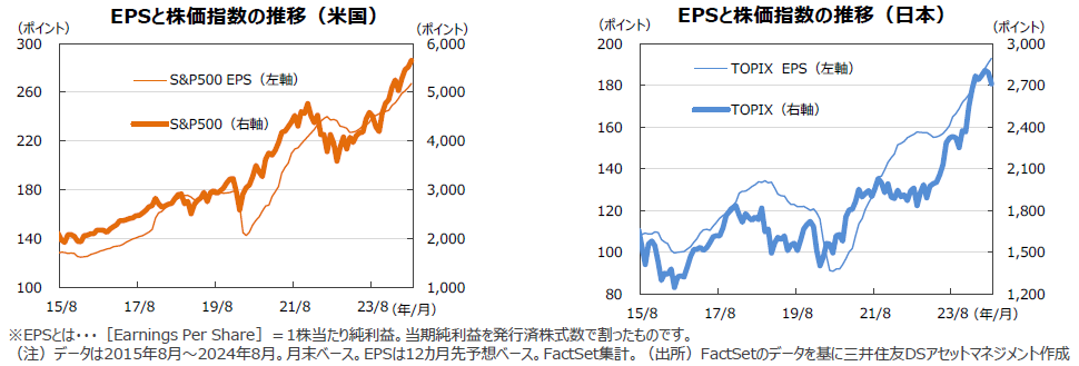 ●米ファクトセット(FactSet)によれば、日米の企業業績は過去最高水準を更新しており、好調を維持しています。8月末の米S&P500種指数の予想1株当たり純利益(EPS)は前年同月比+11.5%、TOPIXの予想EPSは同+17.0%と、いずれも2桁の伸びとなりました。