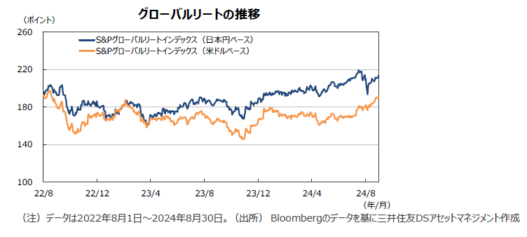 ●グローバルリート市場(米ドルベース)は、FRBによる9月の利下げ観測が高まり、米長期金利が低下したことを好感して、上昇しました。S&Pグローバルリート指数のリターンは前月末比+5.8%でした。また、円ベースのリターンは、為替効果がマイナスに寄与し、同+2.4%となりました。
