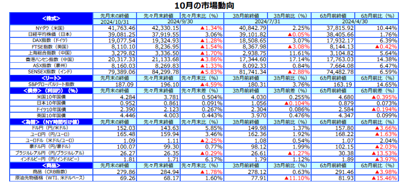●米国株式市場は、米景気のソフトランディング観測から一時最高値を更新しました。しかし、11月5日の米大統領選を控えたリスク回避の動きなどから月末にかけて値を崩し、前月比で下落して終了しました。NYダウは前月比▲1.3%、S&P500種指数は同▲1.0%と、小幅安となりました。
