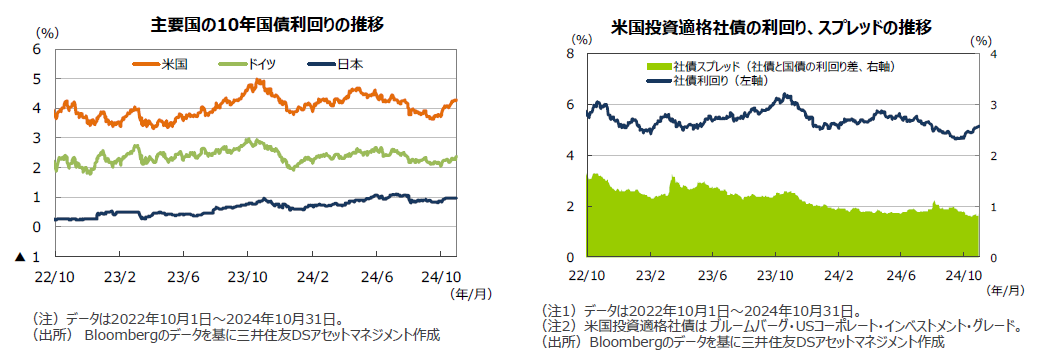●米国の10年国債利回り(長期金利)は、9月の雇用統計が市場予想を上回り、FRBの利下げペースが緩やかになるとの観測が広がったことや、トランプ前大統領が勝利した場合のインフレ圧力の高まりが意識され、大幅に上昇しました。