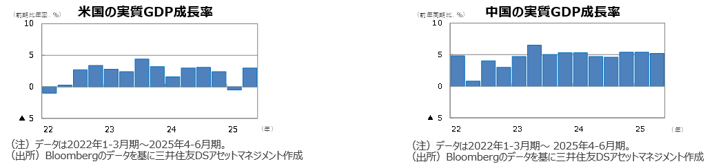 ●米国の25年の実質GDP成長率見通しを+1.5%に修正しました。4‐6月期は、相互関税導入前の駆け込み輸入の反動で輸入が減少し、GDP成長率は急回復しました。しかし、関税引き上げの影響により、7-9月期にかけインフレ率は上振れ、経済成長は鈍化する見込みです。実効関税率は15~20%上昇する見通しですが、景気後退は回避できると見られます。26年には減税等の効果が現れ、景気は持ち直すと予想します。