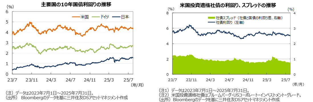 ●ドイツでは長期金利が上昇しました。EUが相互関税で米国と合意したため先行きに対する不透明感が薄らぎ、国債など安全資産に対する需要が後退した模様です。ただし、防衛費の拡大が財政収支を大きく悪化させるとの懸念が、期間プレミアムを高止まりさせているようです。