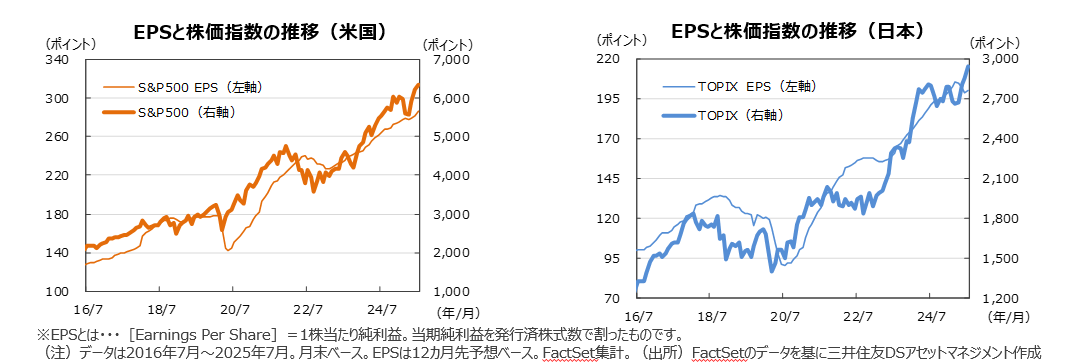 ●米ファクトセット(FactSet)によれば、日米の企業業績の見通しは堅調です。7月末の米S&P500種指数の予想1株当たり純利益(EPS)は前年同月比+8.4%、TOPIXの予想EPSは同+4.7%となりました。TOPIXのEPSの下方修正が続いています。