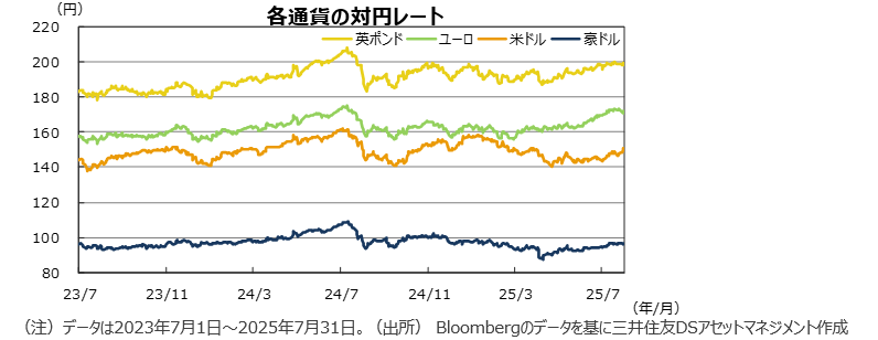 ●円の対米ドルレートでは、月前半は、トランプ関税や参院選を控え拡張財政への懸念から、円安となりました。参院選後、石破首相が続投を宣言し一時的に円高となりましたが、米新規失業保険申請件数が4月以来の低水準となり、早期の米利下げ観測が後退し、円安となりました。