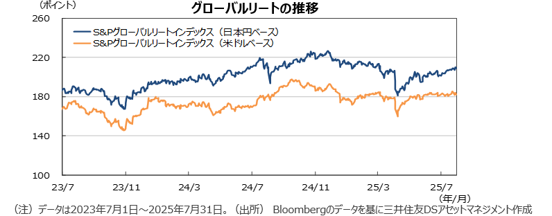 ●グローバルリート市場は、米国の関税政策や長期金利動向に左右される不安定な展開が想定されます。米国では月後半低下したとはいえ、長期金利が高止まりしており、住宅投資、設備投資も含め投資の決定に影響が出ているようです。欧州では、EUやドイツの財政政策変更の影響で長期金利が高止まりしていますが、世界的にみると金利は低水準で、リスク資産を増やす動きの一環でリート市場への資金流入が期待できそうです。