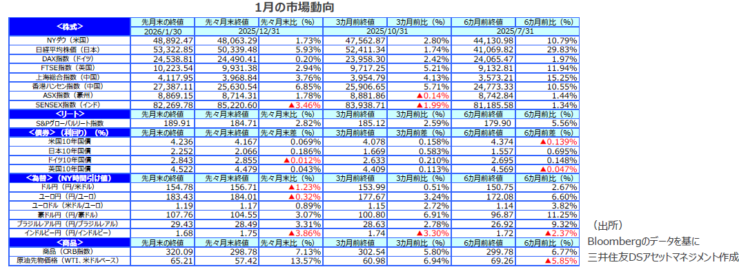 1月の米国、日本の株式市場では、メモリーなど半導体株を中心にAIデータセンター関連のハイテク銘柄の株価が好調でした。貴金属など資源株、防衛関連の銘柄は欧州、豪州の株式市場をけん引しました。ただ、マイクロソフト、インテル、米国医療保険会社、SAP、など大型銘柄の個別要因による株価調整が指数の上値を押さえました。中国、香港市場は政府の景気テコ入れ期待から上昇しましたが、インドは外国人投資家の利益確定売りにより下落しました。 |