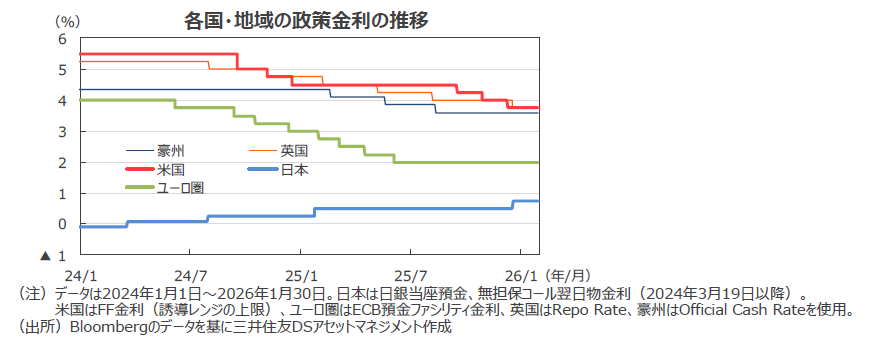 ●米連邦準備制度理事会(FRB)は、1月の政策決定委員会で政策金利を据え置きました。「インフレ率は幾分高め」で「失業率には安定化の兆しがいくらかみられる」ことが据え置きの理由のようです。パウエル議長は、「関税の影響がピークに達すれば、政策の緩和が可能になる」とコメントしており、市場参加者の間では26年中の利下げの可能性に関する議論が始まりました。
