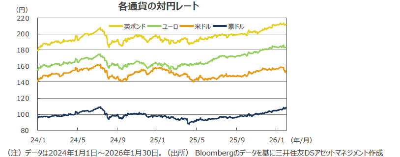 ●ユーロ・米ドルレートは、グリーンランドをめぐり欧米が対立し、欧州勢が米ドル建て資産を売却したとみられることからユーロ高となりました。ユーロ・円レートでは、日本の長期金利が上昇しユーロ高の進行に歯止めがかかりました。月間ではドルに対する介入警戒感もあり、ユーロに対しても円高となりました。