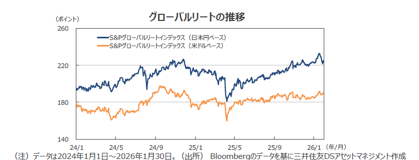 ●日本では、オフィス賃貸市場のファンダメンタルズ改善が続くとともに、首都圏のマンション価格の上昇が続いています。東証の投資家主体別売買動向によると、12月、投資信託、事業法人、個人投資家が買い越す一方で、海外投資家と金融機関が売り越しとなりました。S&Pグローバルリート指数の1月のリターンは、構成比の大きい米国が堅調で、欧州が好調であったことから前月末比+2.82%となりました。月間の換算用の円ドルレートが円高となり、円ベースのリターンも同+1.19%となりました。