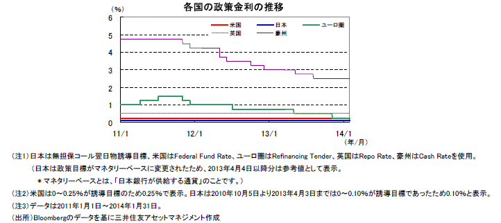 FRBは今後も100億ドルずつQEを縮小し、今秋にも終了させると見られます。金利先物などから見ると、2015年半ばから後半に利上げが開始されると、市場は織り込んでいます。ECBは景気と物価が上向く兆しが無ければ、資産購入などの追加策を導入する可能性があります。日銀は年+2%の物価上昇という目標に向けて量的・質的金融緩和を続けており、緩和策を拡充する可能性もありそうです。
