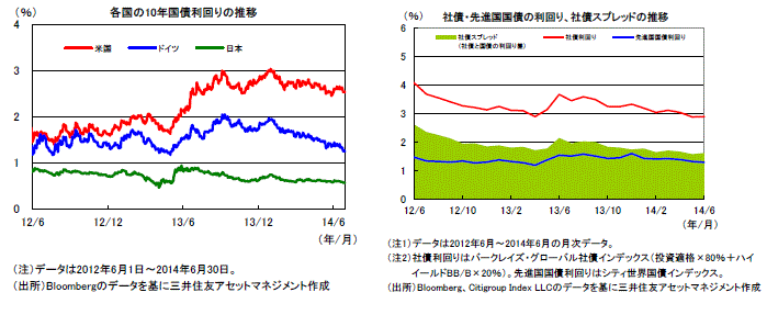 米国では、国債利回りが前月まで低下を続け、6月も低水準で一進一退となりました。欧州では、ECBの金融緩和策を受け、国債利回りの低下が続きました。日本では、米欧の国債利回りの低下傾向の影響を受け、国債利回りがやや低下しました。社債スプレッド(国債との利回り差)は、社債利回りが一進一退だった一方、国債利回りの低下傾向を受けて、拡大しました。