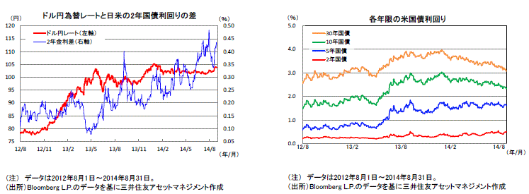市場の織り込みから見ると、利上げ開始は2015年半ば、もしくはそれ以降と見られます。また、米国の景気回復は緩やかなこと、地政学リスクがくすぶることなどから、米国債への需要はなお強く、金利上昇ペースは緩やかと見られています。