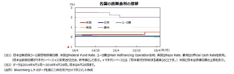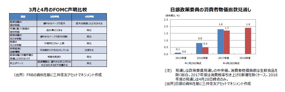 米連邦準備制度理事会(FRB)は4月26日、27日の米連邦公開市場委員会(FOMC)で政策金利の据え置きを決定しました。経済活動の現状判断が下方修正され、前回「引き続きリスクをもたらしている」とされた「世界経済と金融情勢」は、物価動向とともに「注視する」という表現に変更されました。また日銀は4月27日、28日の金融政策決定会合で基本現状維持を決定しました。「経済・物価情勢の展望」(展望レポート)では、物価目標の達成時期が「2017年度前半頃」から「2017年度中」へ先送りされ、景気と物価見通しが広く下方修正されました。