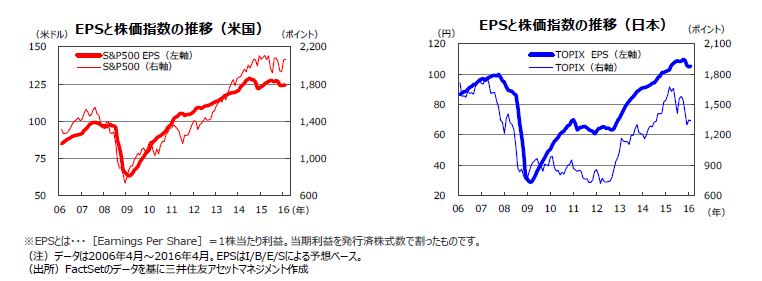 米国の主要企業の2016年1-3月期の増益率は前年同期比▲5.7%(トムソン・ロイター調べ、4月29日集計時点)と、エネルギー業種の大幅な減益(同▲112.7%)の影響を受け、弱めの予想です。続く4-6月期は同▲3.0%、7-9月期は同+2.7%、10-12月期は同+9.6%、2017年1-3月期は同+16.8%と、次第に回復が見込まれています。一方、日本の2016年度の経常利益は1桁台の増益が予想されています。