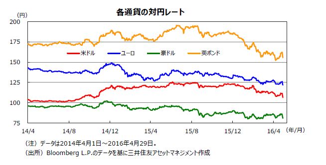 ドル円相場は、米ドルからみて下落スピードが速く、落ち着きを待つ展開です。米ドルの水準は、追加利上げが極めて緩やかとの期待の上に成り立っていることから、6月の利上げの可能性が高まる指標が発表されるかが重要です。一方、中国などの新興国経済の減速懸念は依然くすぶっているほか、原油・資源価格の値動きも予断を許さない状況が続いています。リスク回避の動きが強まる場合には、円高が進むリスクも引き続き考えられます。