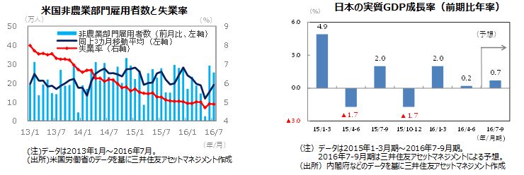 米国の株式市場は、一時NYダウなど主要株価指数が史上最高値を更新しましたが、その後米国の早期利上げ観測が浮上し、上値が重くなりました。 欧州の株式市場は、英国の欧州連合(EU)離脱選択による混乱の沈静化に加え、銀行株が大きく反発したことを受けて底堅い展開となりました。 日本の株式市場は、日銀が7月末の金融政策決定会合で上場投資信託(ETF)の購入額の増額を決めたことで底堅く推移し、2カ月連続で上昇しました。米国の早期利上げへの思惑が浮上し、為替が円安に振れたことも株式相場を押し上げました。 |