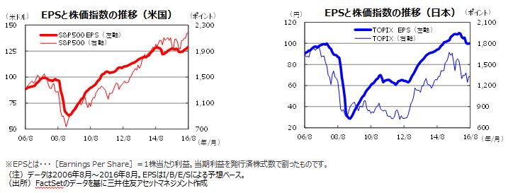 S&P500指数の1株当たり予想利益(EPS)は上昇傾向にあります。7-9月期は同▲0.6%、10-12月期は同+8.3%、17年1-3月期は同+15.1%、17年4-6月期は同+12.7%と回復が見込まれています。一方、日本の東証株価指数(TOPIX)の予想EPSは16年6月に当面の底をつけたもようです。7、8月と若干ですが上昇しました。